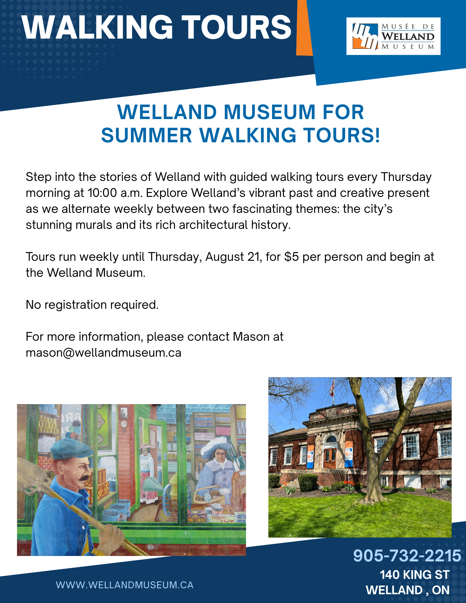 Step into the stories of Welland with guided walking tours every Thursday morning at 10:00 a.m. Explore Welland’s vibrant past and creative present. Whether you're a local history buff or a curious visitor, these tours offer a unique way to experience Welland on foot. No registration required—just bring your walking shoes and your curiosity! For […]