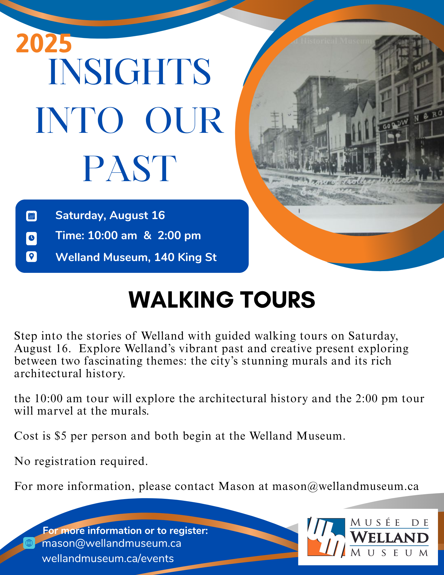Step into the stories of Welland with guided walking tours every Thursday morning at 10:00 a.m. Explore Welland’s vibrant past and creative present. Whether you're a local history buff or a curious visitor, these tours offer a unique way to experience Welland on foot. No registration required—just bring your walking shoes and your curiosity! For […]