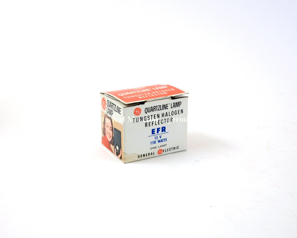 b) Cardboard light bulb box. White with red top flap, says "GE Quartzline Lamp" and has a picture of a woman holding some form of video camera.