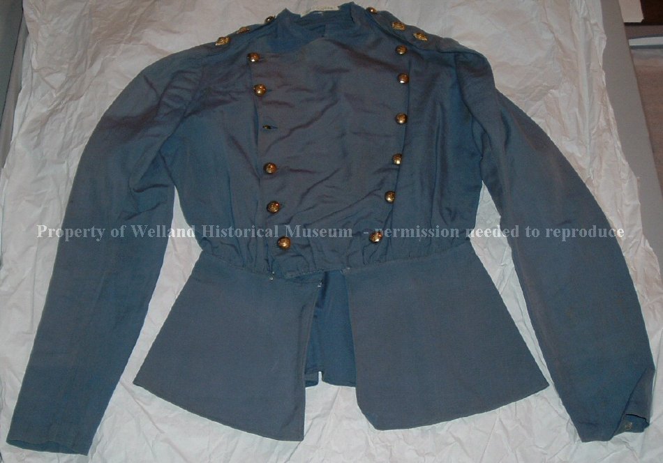 a) Blue cotton jacket with 2 rows of brass buttons down front. Buttons have medical crest with snake on them. Inside of waist are 3 hooks to fasten to skirt. Short flared waist which fits over skirt. Pleated at top of waist and fastens with 2 hook and eyes. Small thermometer pocket at right breast. 2 square and one round brass button on either shoulder.