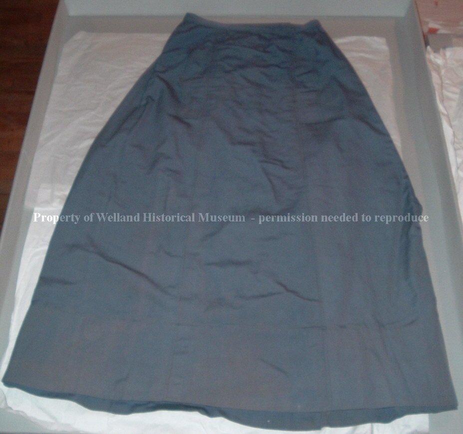 b) Blue cotton skirt with 2 seams down front and back. Looks like 2 pockets at front, sideways, but one fastens with one snap and other opens with 6 snaps and 2 hooks. At back are 3 eyes to fasten to jacket.